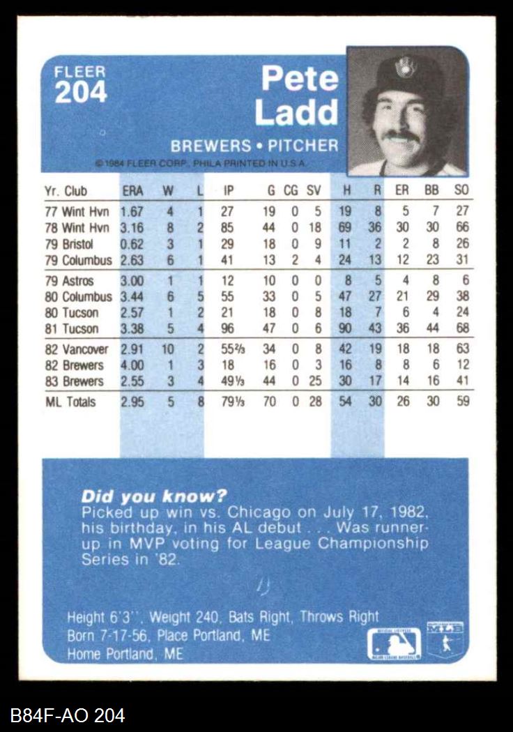 1984 Fleer #204 Pete Ladd 8 - NM/MT
