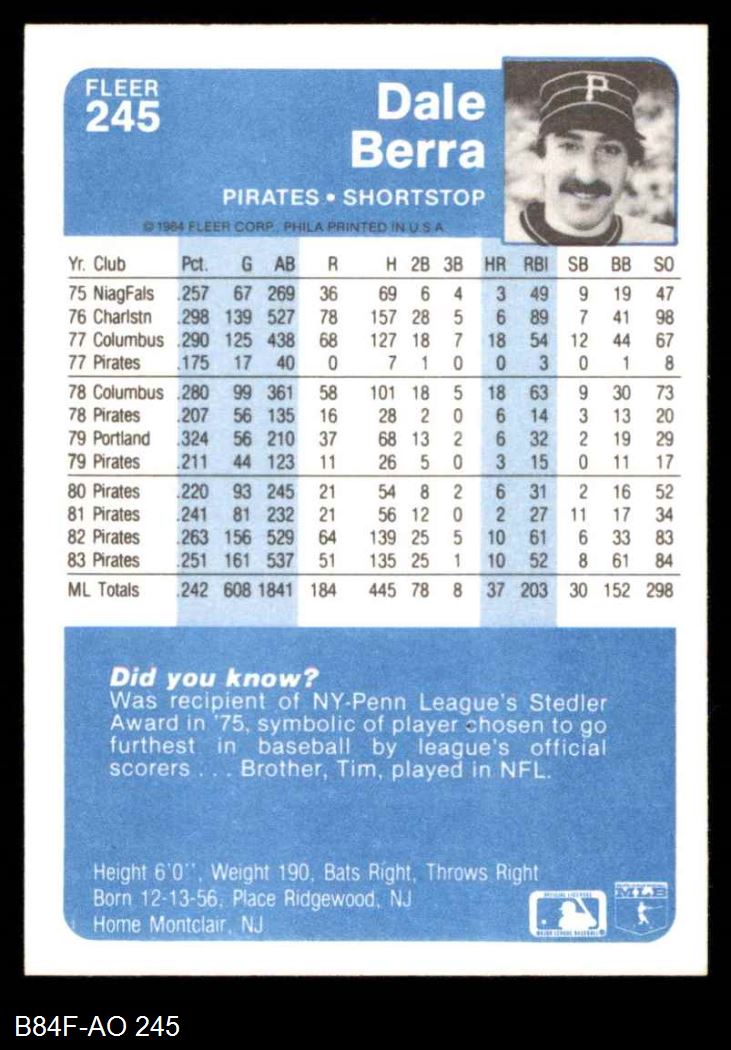 1984 Fleer #245 Dale Berra 8 - NM/MT