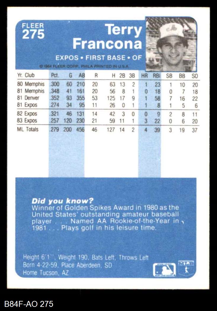 1984 Fleer #275 Terry Francona 8 - NM/MT