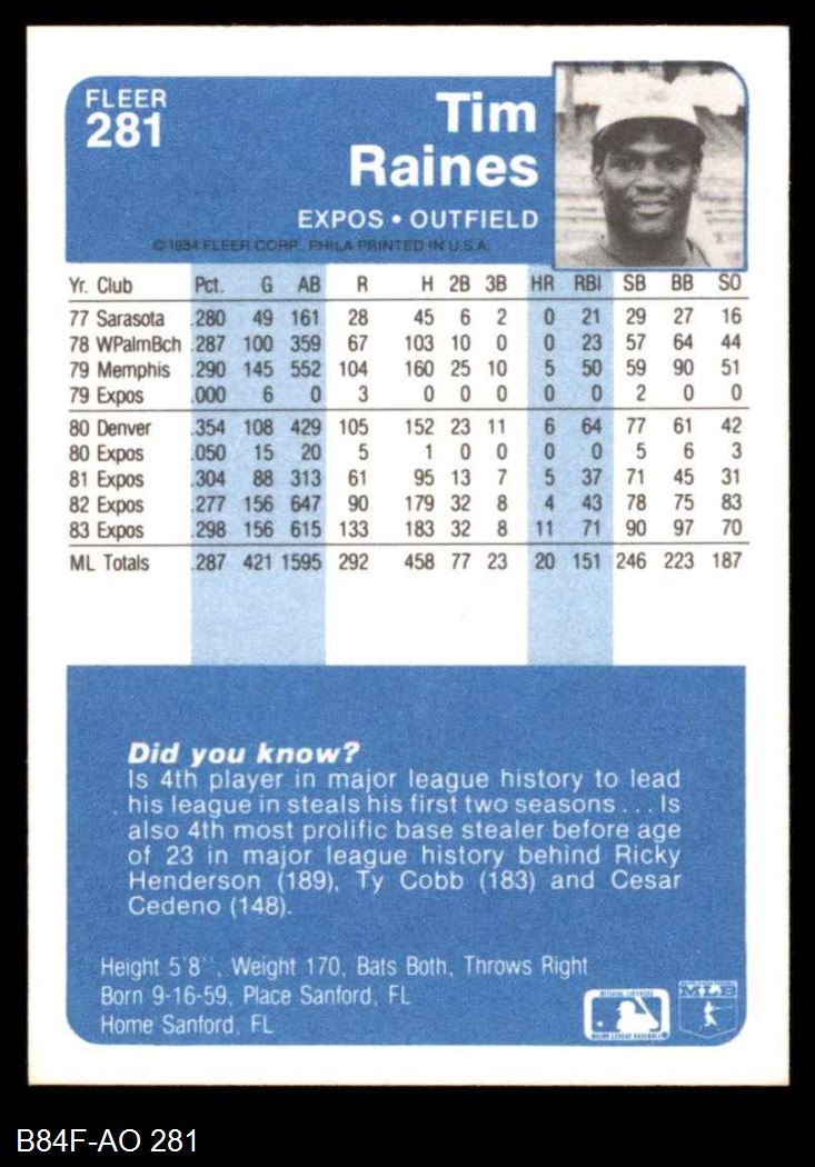 1984 Fleer #281 Tim Raines 8 - NM/MT