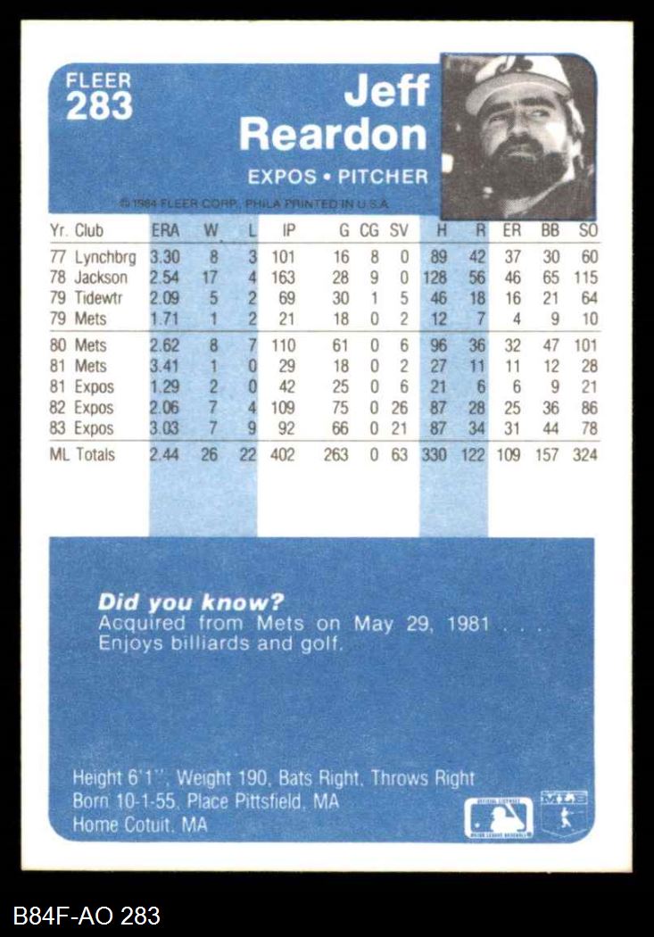 1984 Fleer #283 Jeff Reardon 8 - NM/MT