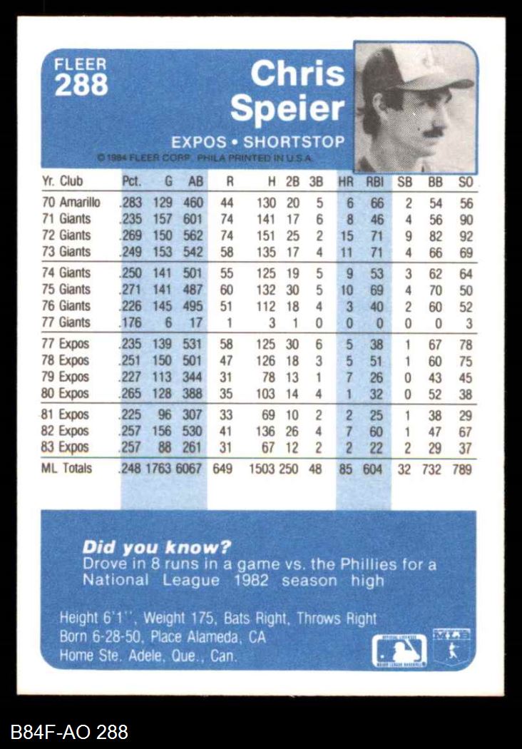 1984 Fleer #288 Chris Speier 8 - NM/MT