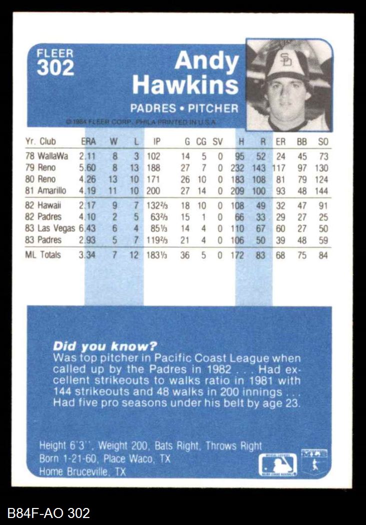 1984 Fleer #302 Andy Hawkins 8 - NM/MT