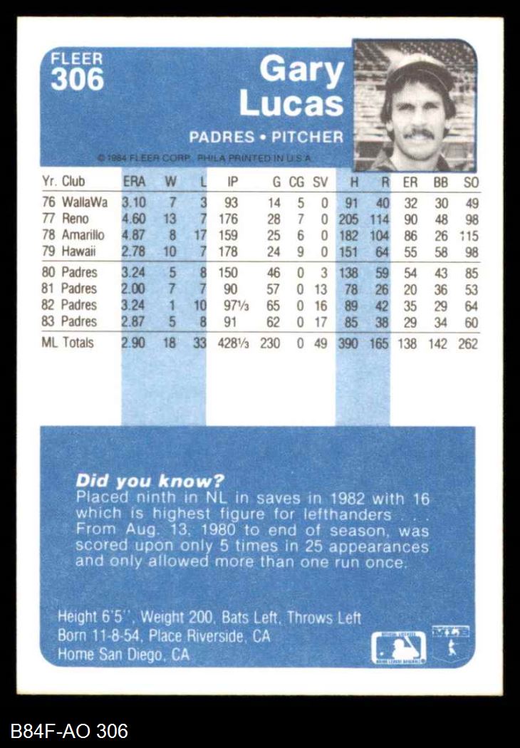 1984 Fleer #306 Gary Lucas 8 - NM/MT