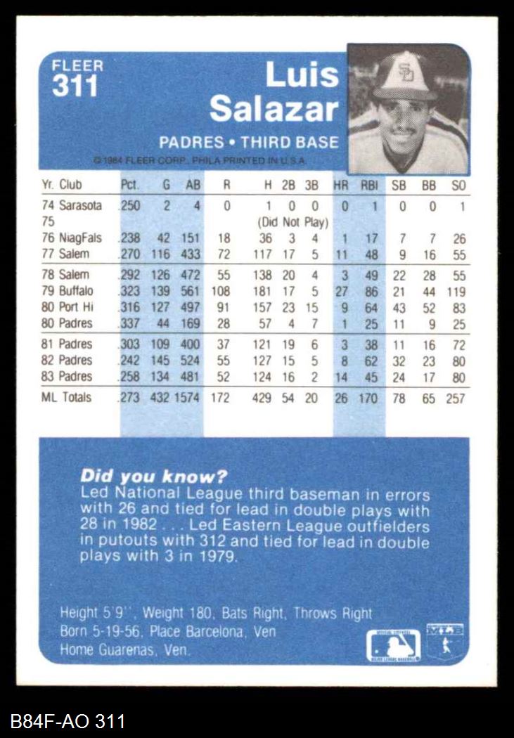 1984 Fleer #311 Luis Salazar 8 - NM/MT