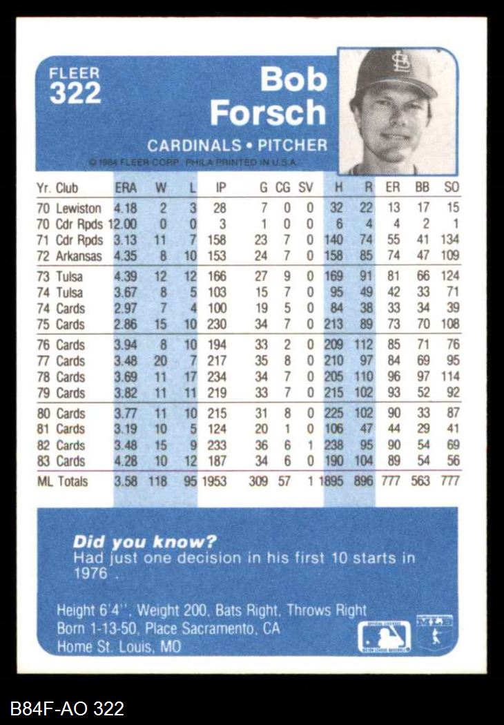1984 Fleer #322 Bob Forsch 8 - NM/MT