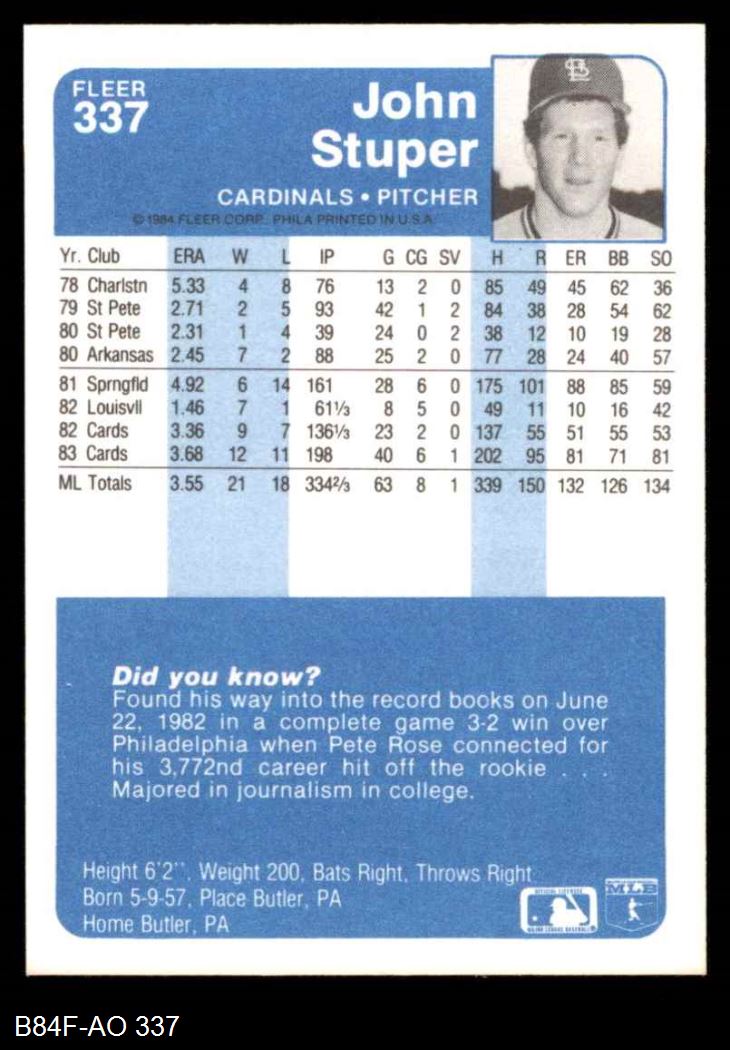 1984 Fleer #337 John Stuper 8 - NM/MT