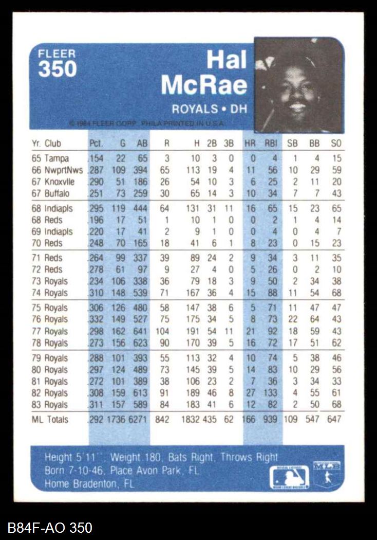1984 Fleer #350 Hal McRae 8 - NM/MT