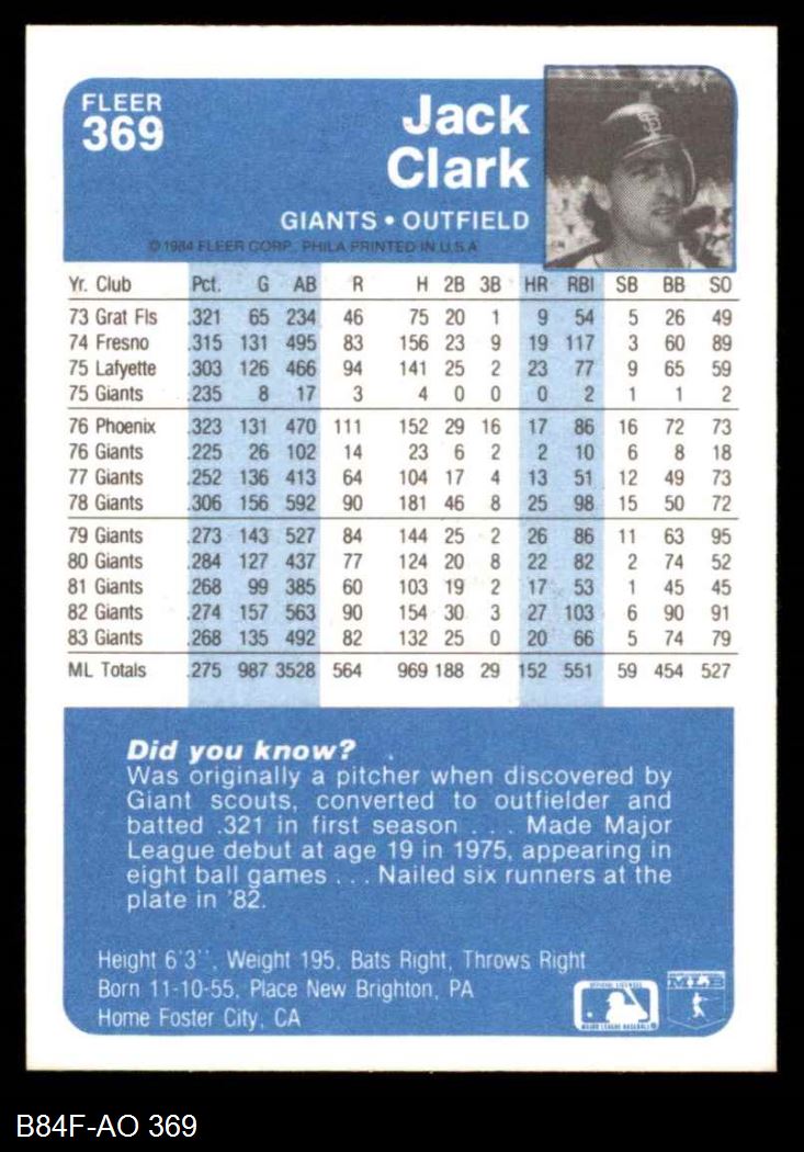 1984 Fleer #369 Jack Clark 8 - NM/MT
