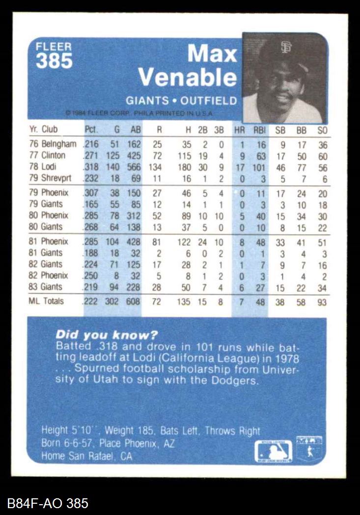 1984 Fleer #385 Max Venable 8 - NM/MT