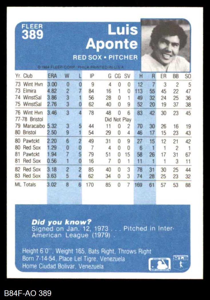 1984 Fleer #389 Luis Aponte 8 - NM/MT