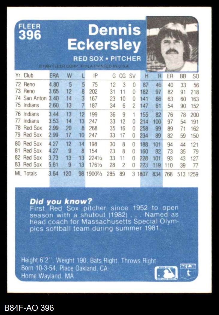 1984 Fleer #396 Dennis Eckersley 8 - NM/MT