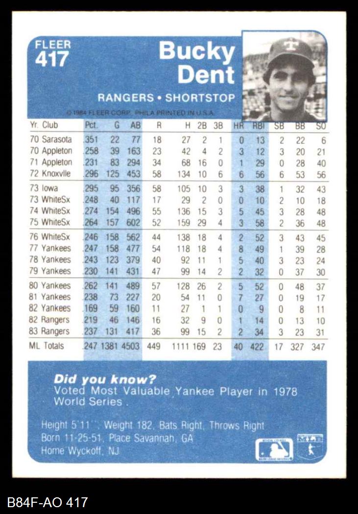 1984 Fleer #417 Bucky Dent 8 - NM/MT