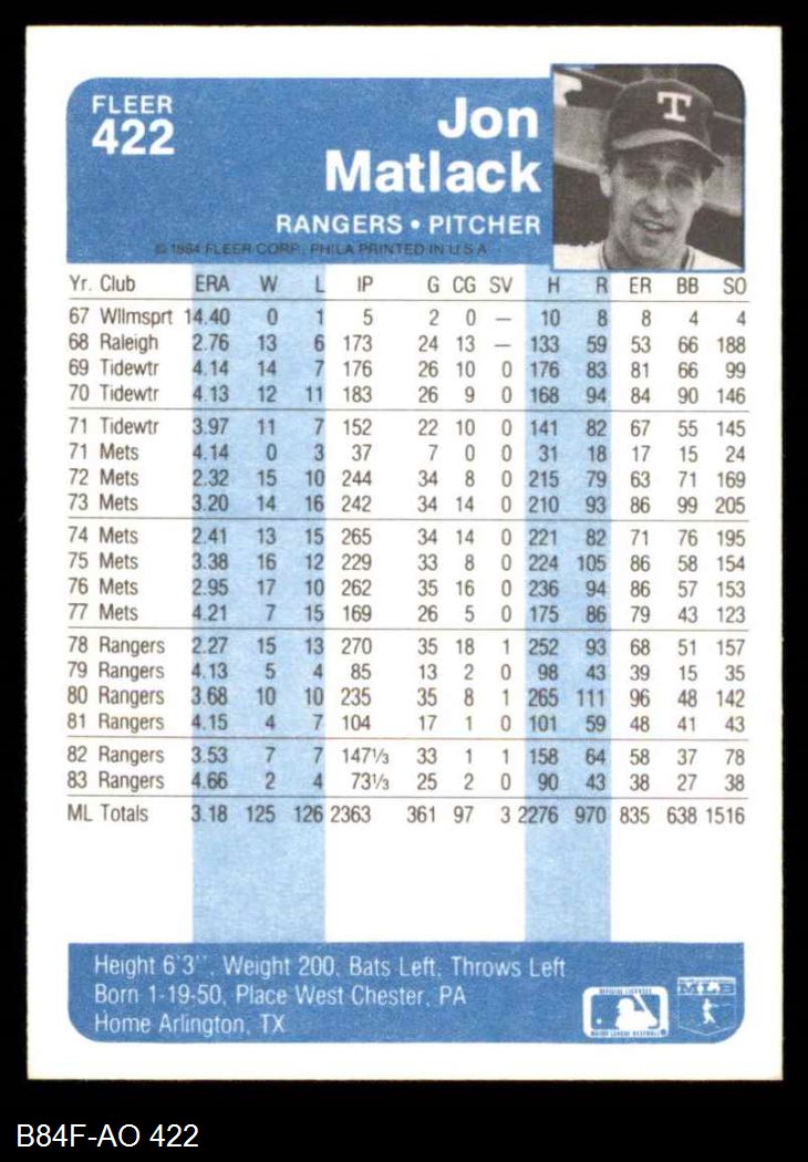 1984 Fleer #422 Jon Matlack 8 - NM/MT