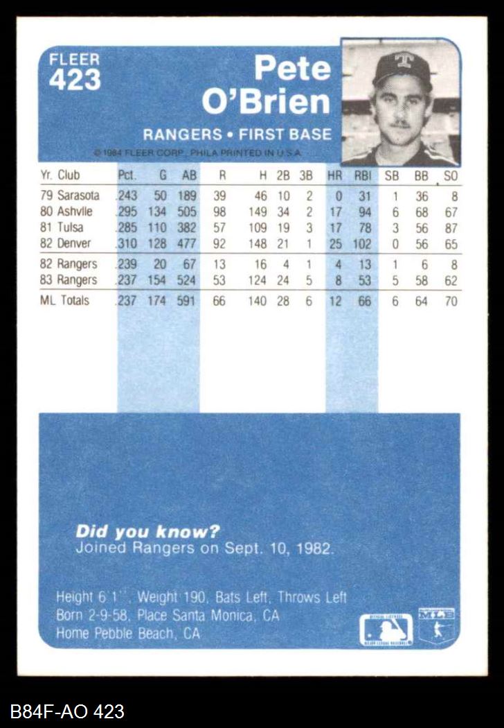 1984 Fleer #423 Pete O'Brien 8 - NM/MT
