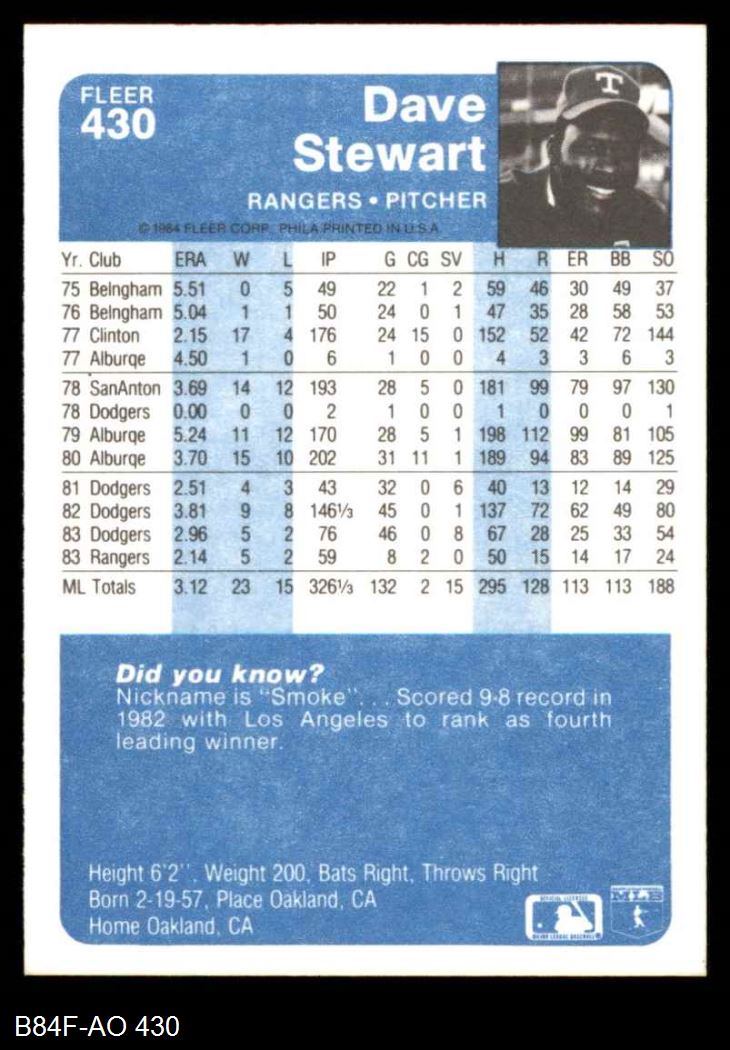 1984 Fleer #430 Dave Stewart 8 - NM/MT