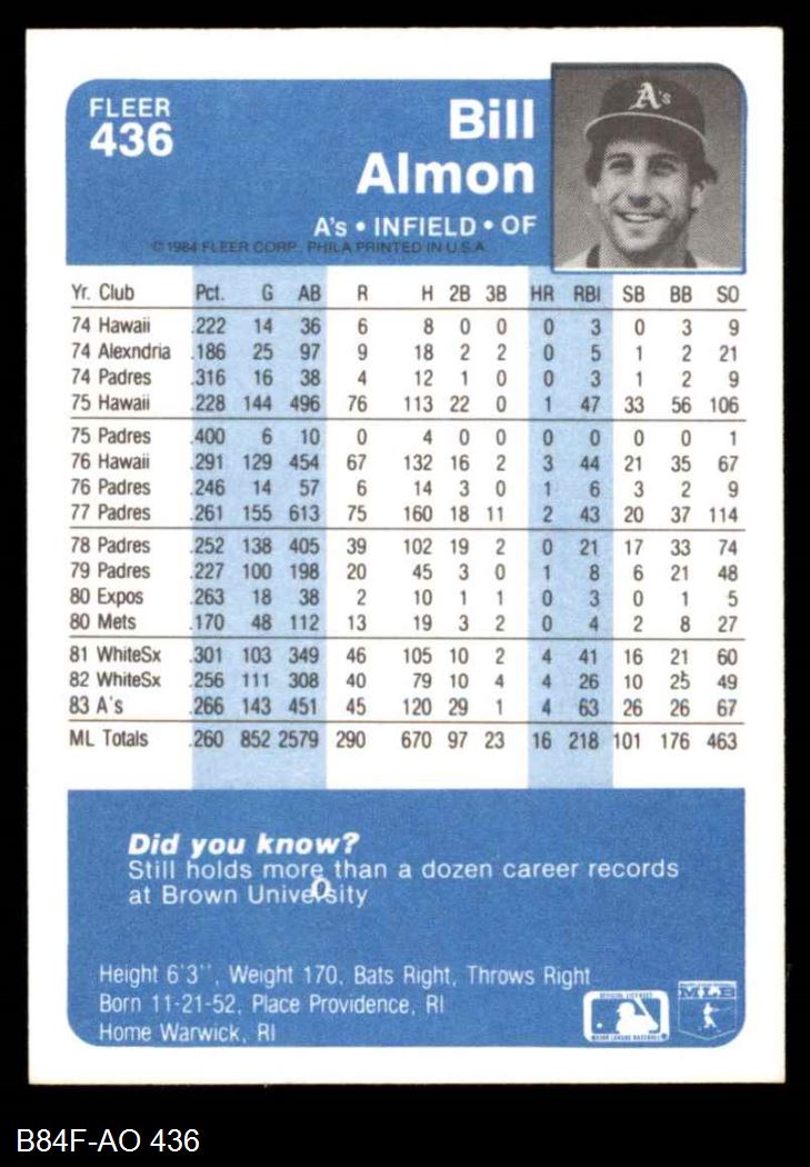 1984 Fleer #436 Bill Almon 8 - NM/MT