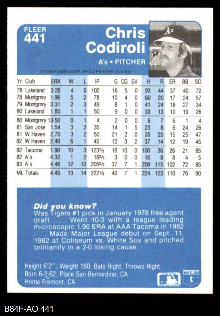 1984 Fleer #441 Chris Codiroli 8 - NM/MT