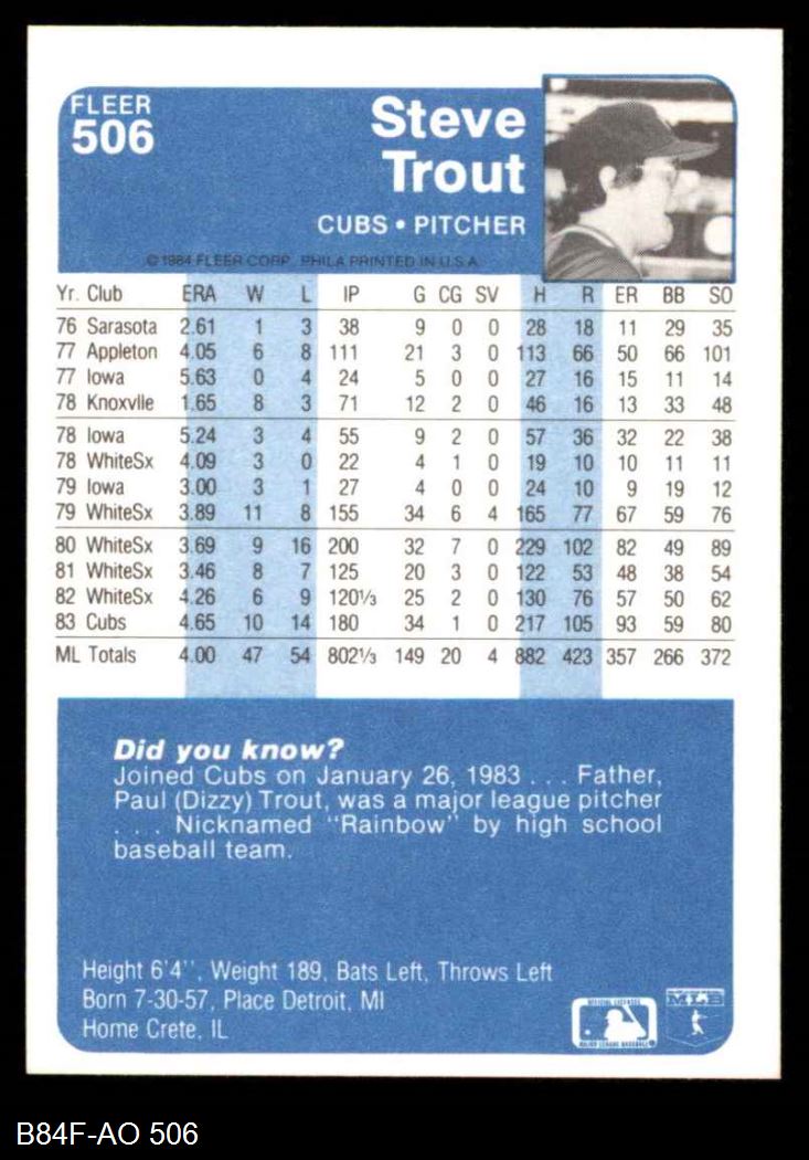 1984 Fleer #506 Steve Trout