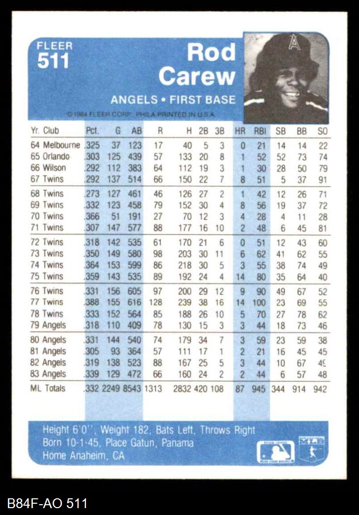 1984 Fleer #511 Rod Carew 8 - NM/MT
