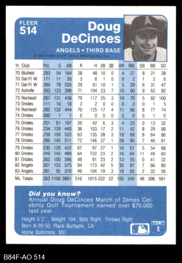 1984 Fleer #514 Doug DeCinces