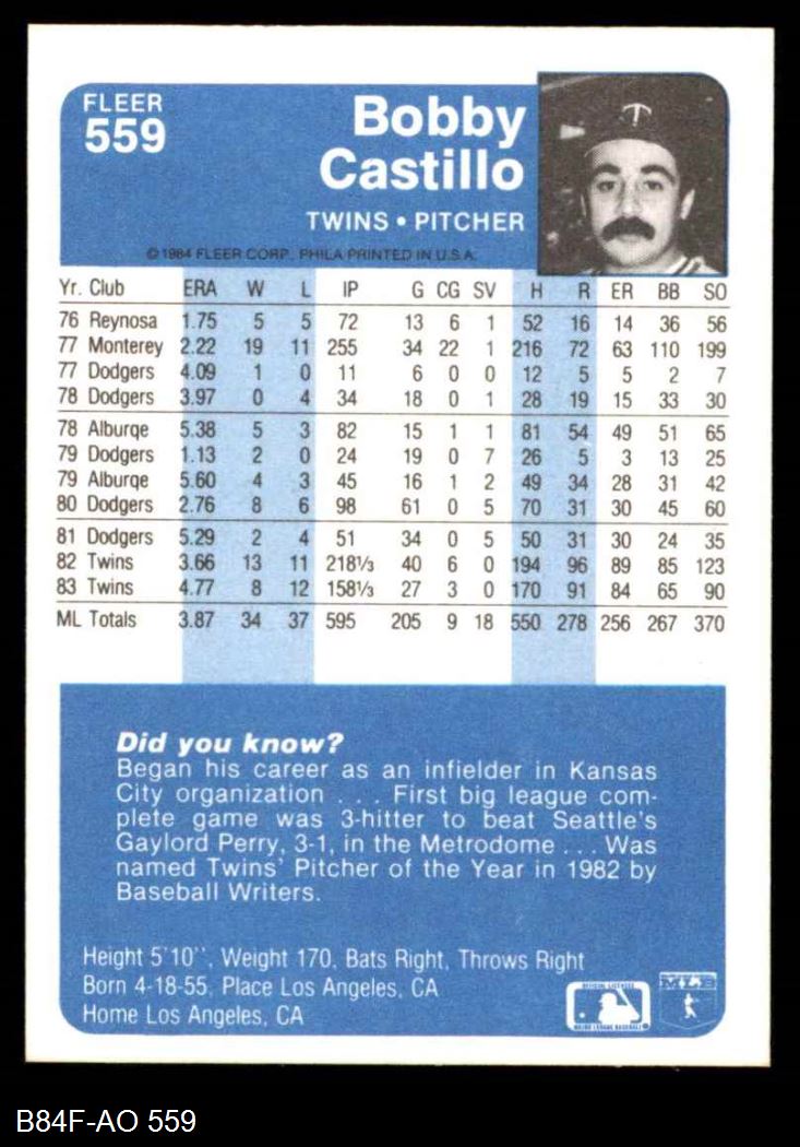 1984 Fleer #559 Bobby Castillo 8 - NM/MT