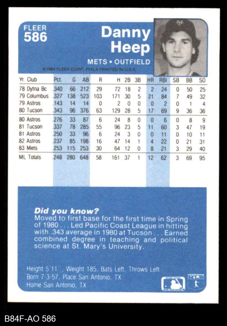 1984 Fleer #586 Danny Heep