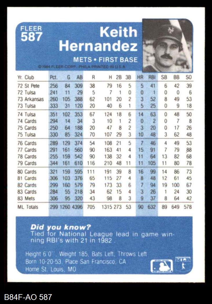 1984 Fleer #587 Keith Hernandez 8 - NM/MT