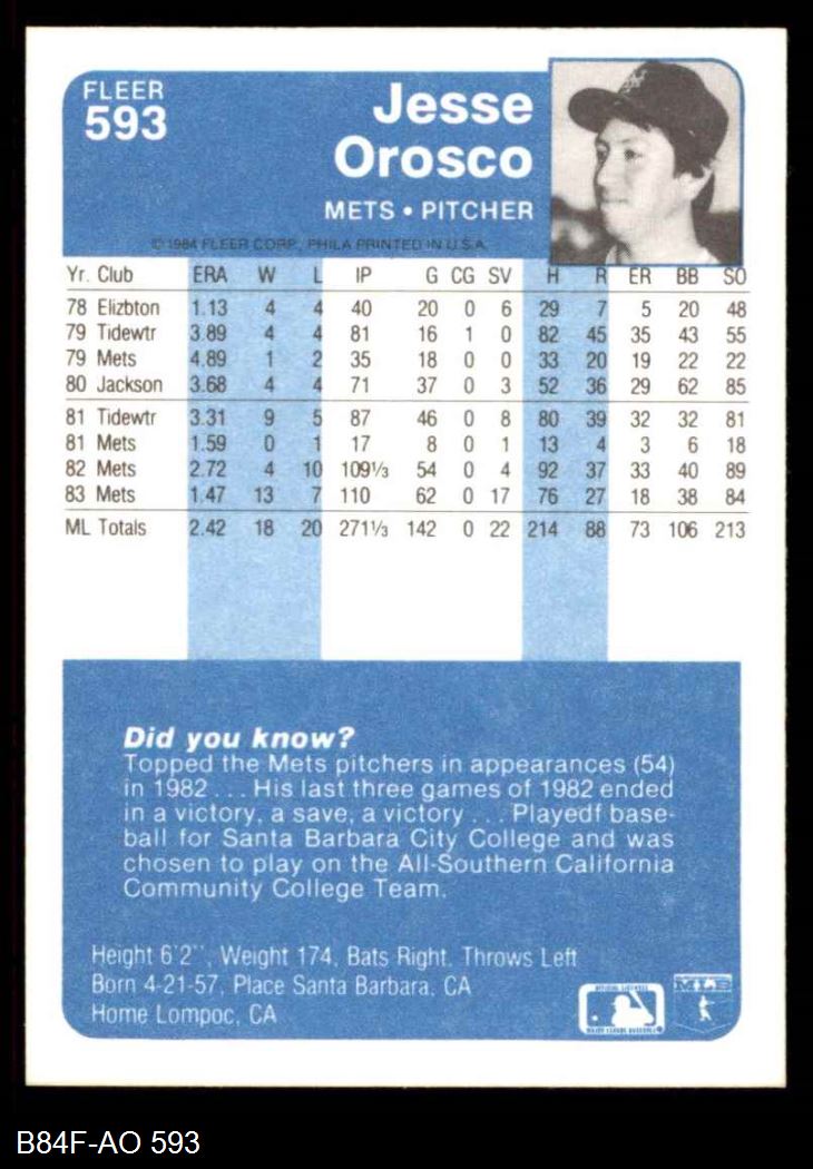 1984 Fleer #593 Jesse Orosco 8 - NM/MT