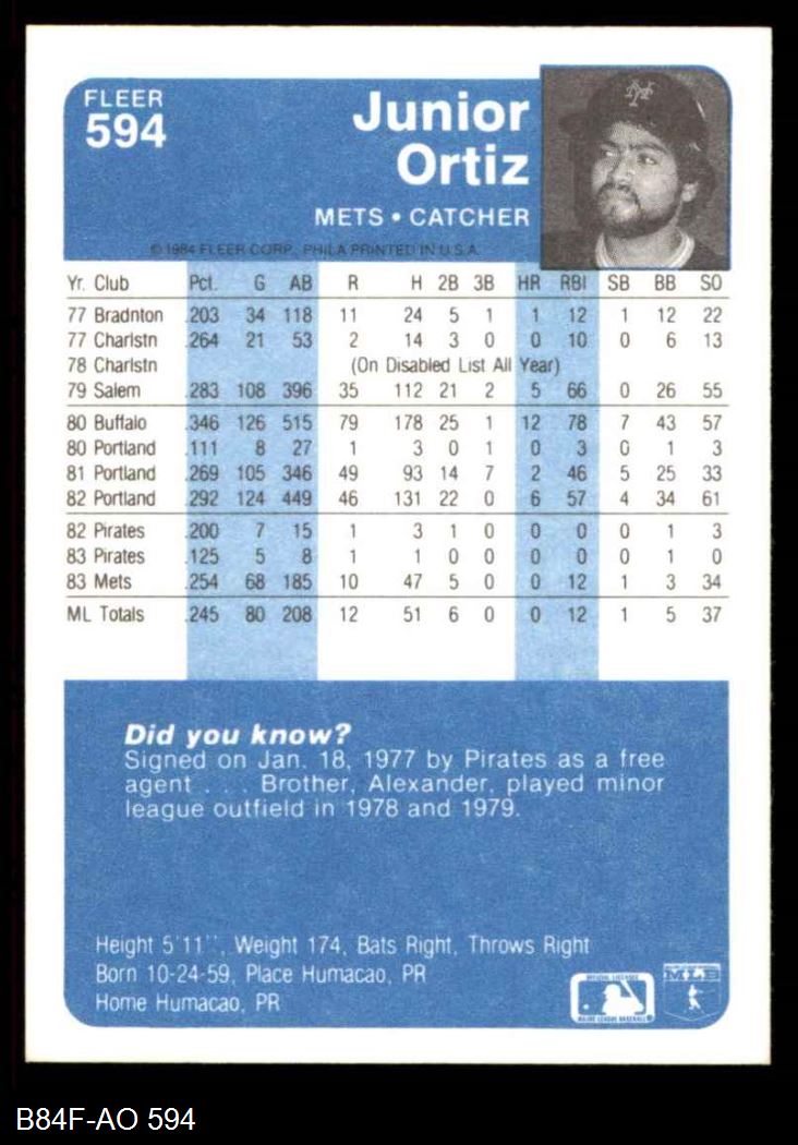 1984 Fleer #594 Junior Ortiz 8 - NM/MT