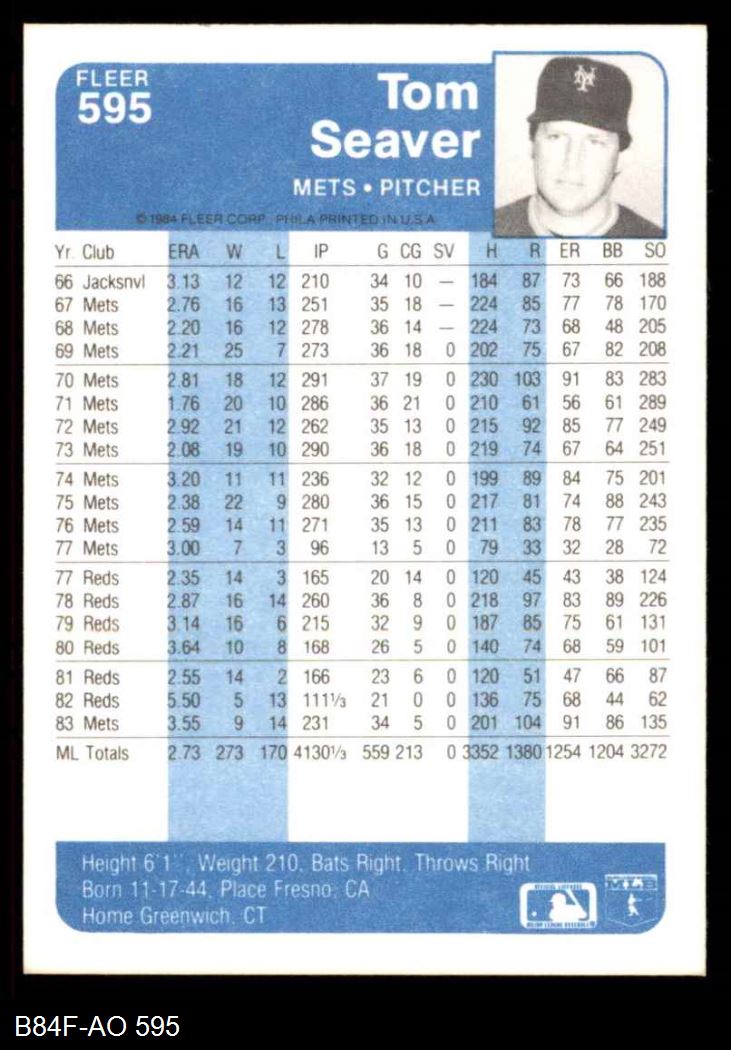 1984 Fleer #595 Tom Seaver 8 - NM/MT