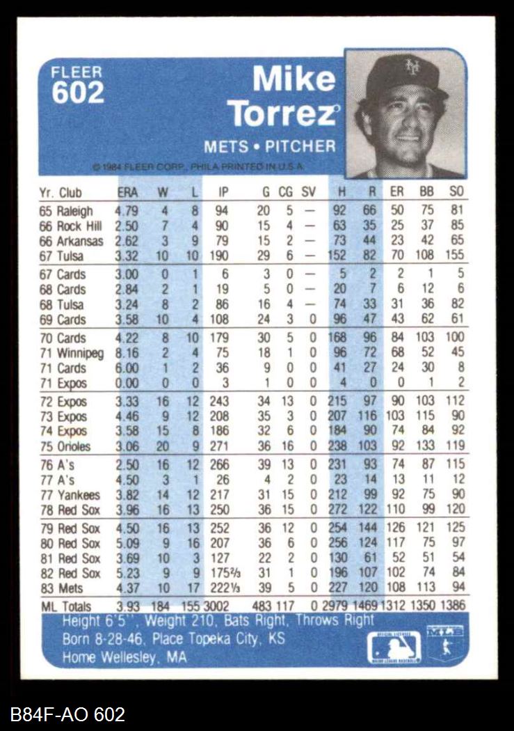 1984 Fleer #602 Mike Torrez 8 - NM/MT