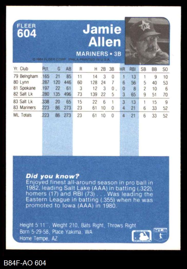 1984 Fleer #604 Jamie Allen 8 - NM/MT
