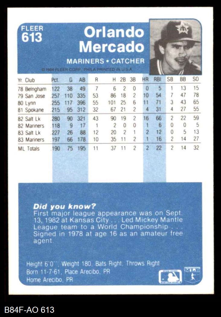 1984 Fleer #613 Orlando Mercado 8 - NM/MT