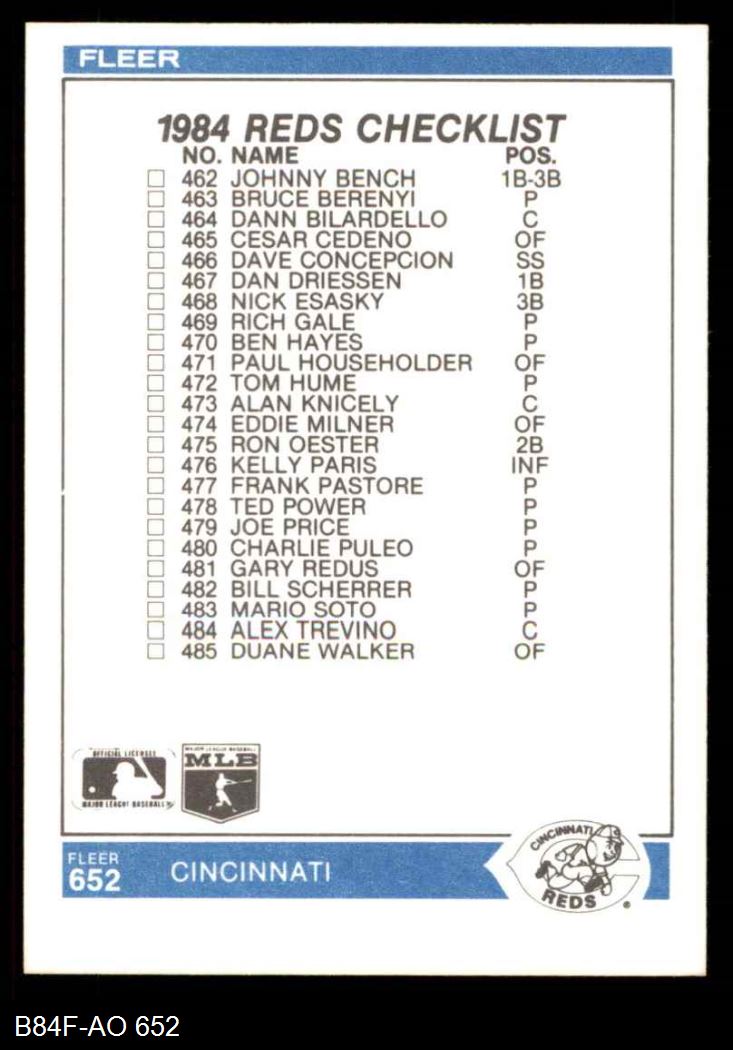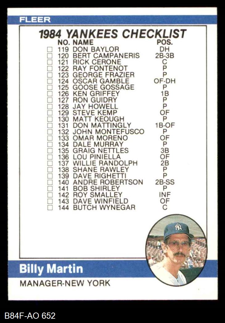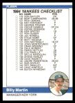 1984 1984 #652 - Billy Martin Checklist: Yankees/Reds 8 - NM/MT