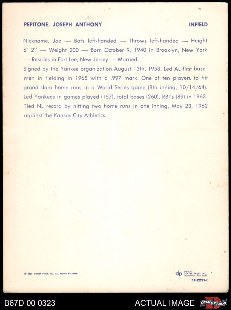 1967 Dexter Press Premiums Joe Pepitone 3 - VG