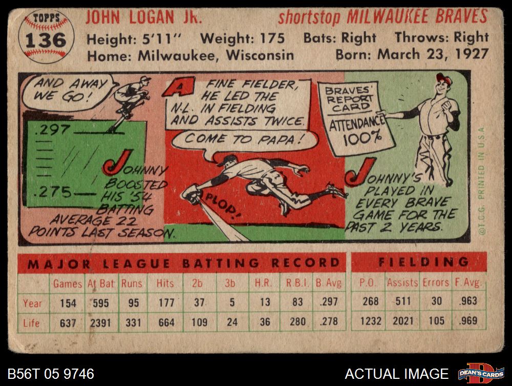 1956 Topps #136 WHT Johnny Logan 1.5 - FAIR