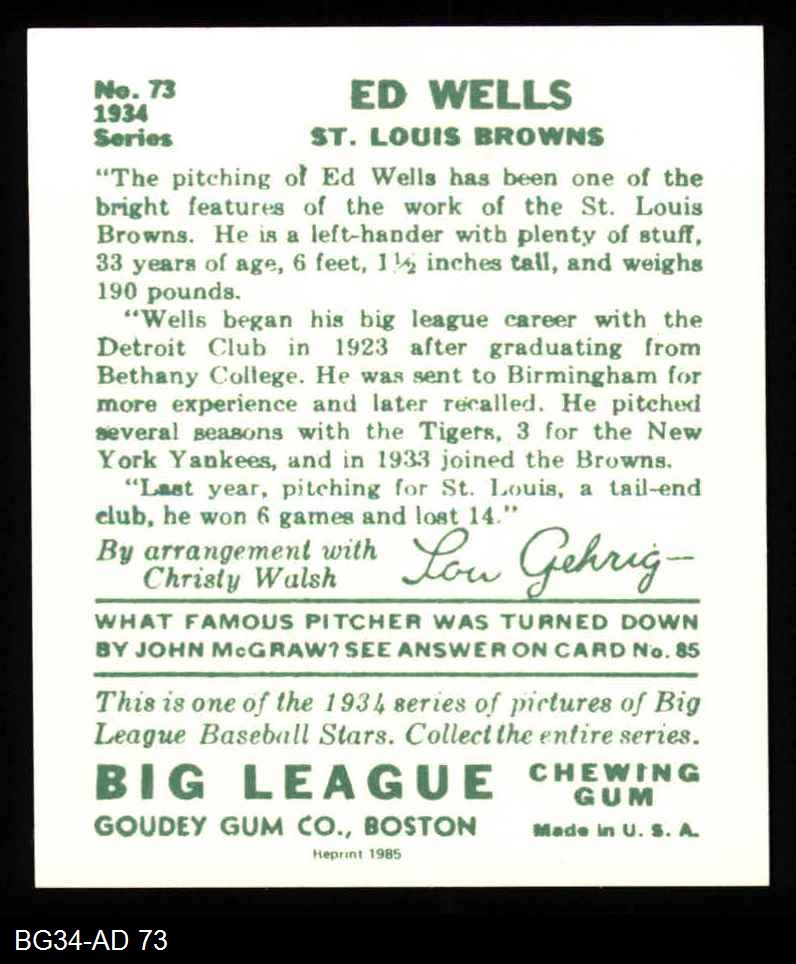1934 Goudey Reprint #73 Ed Wells 8 - NM/MT