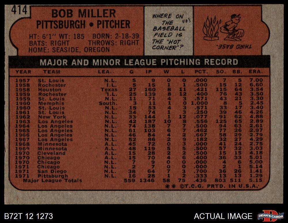 1972 Topps #414 Bob Miller 5 - EX