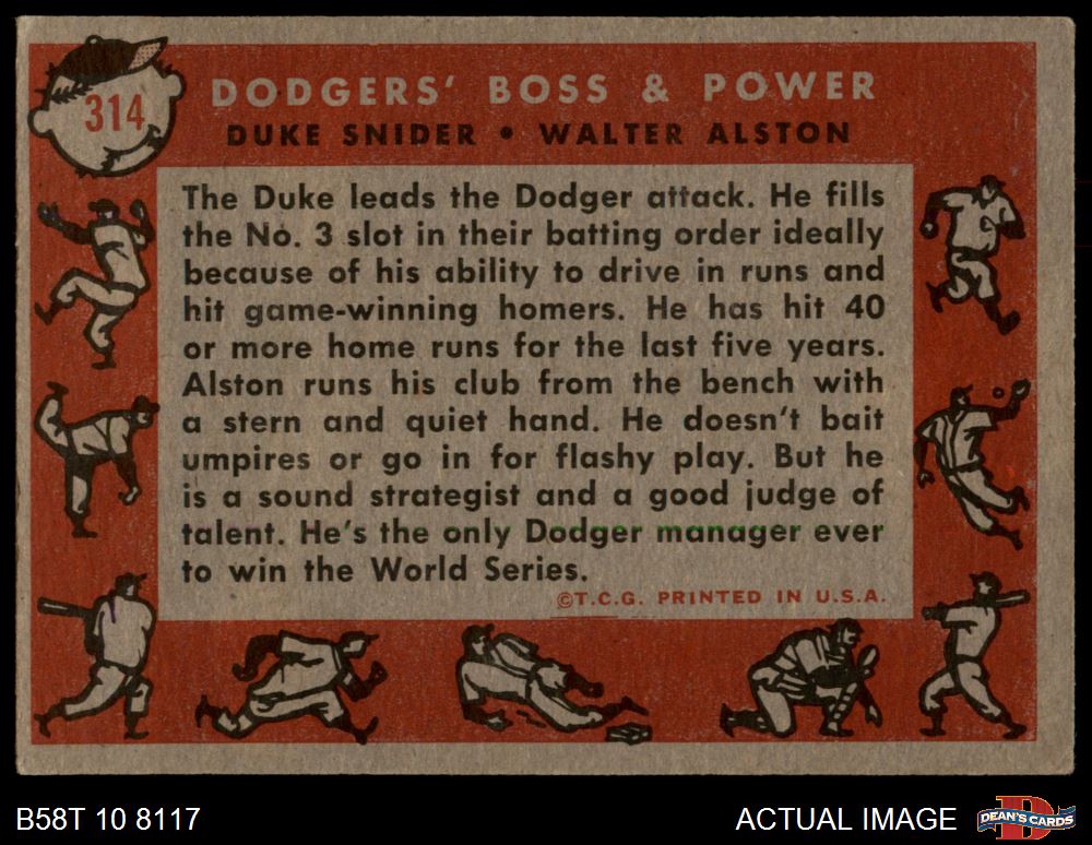 1958 Topps #314 - Walter Alston / Duke Snider Dodgers' Boss & Power 4 - VG/EX