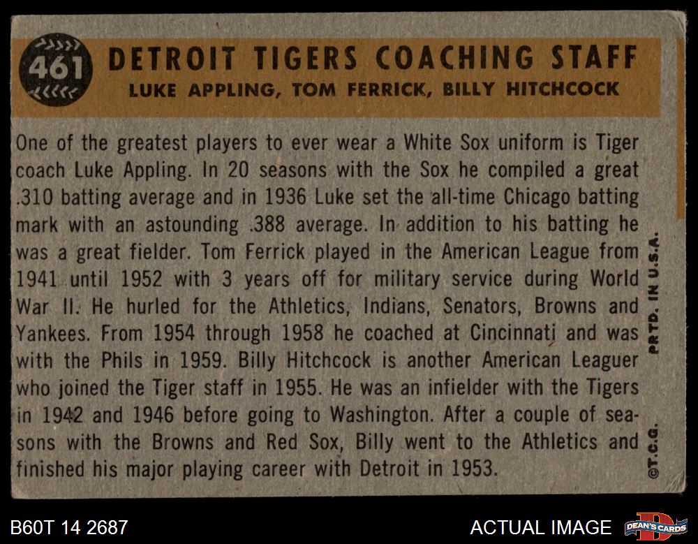 1960 Topps #461 - Tom Ferrick / Luke Appling / Billy Hitchcock Tigers Coaches 2 - GOOD