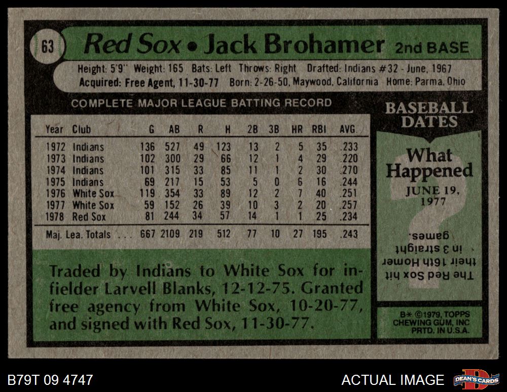 1979 Topps #63 Jack Brohamer 4 - VG/EX