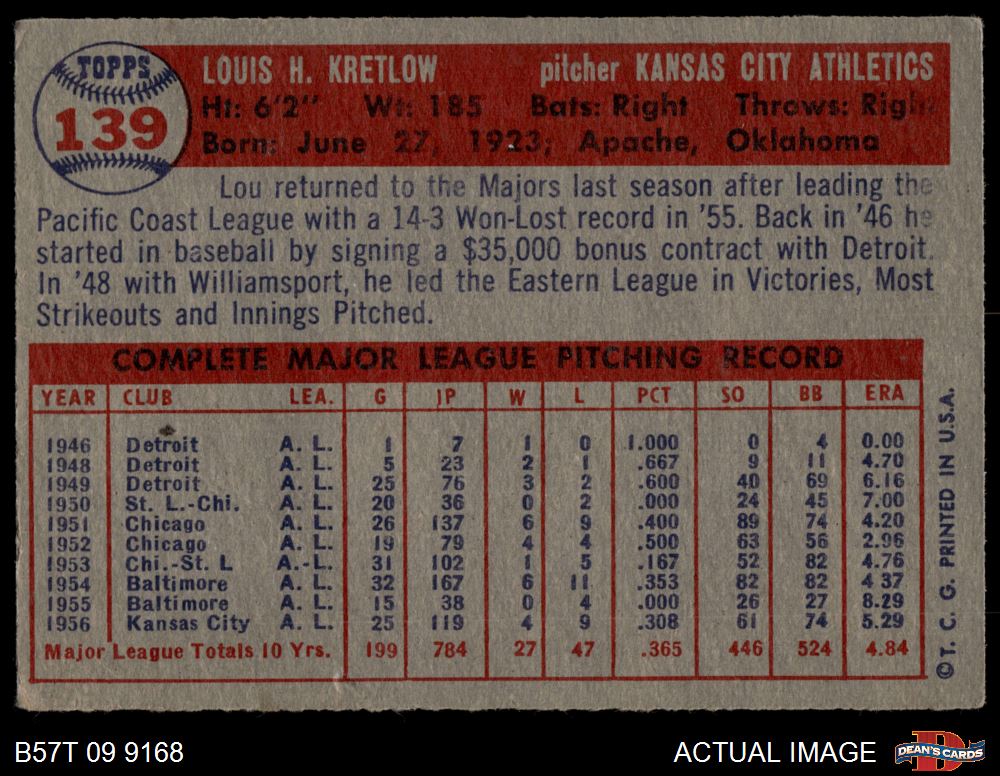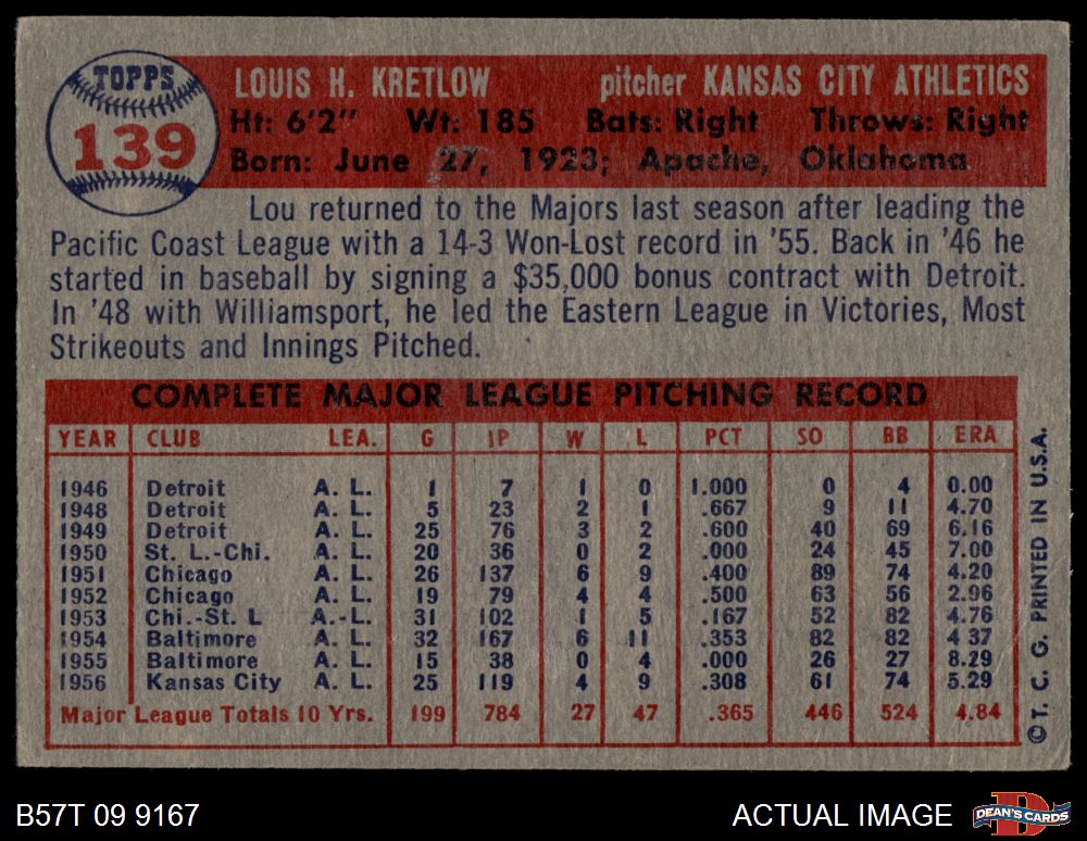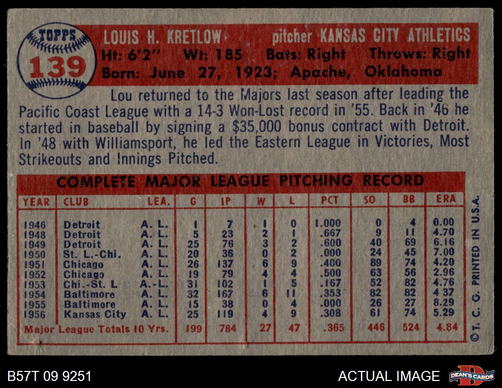 1957 Topps #139 Lou Kretlow 2 - GOOD