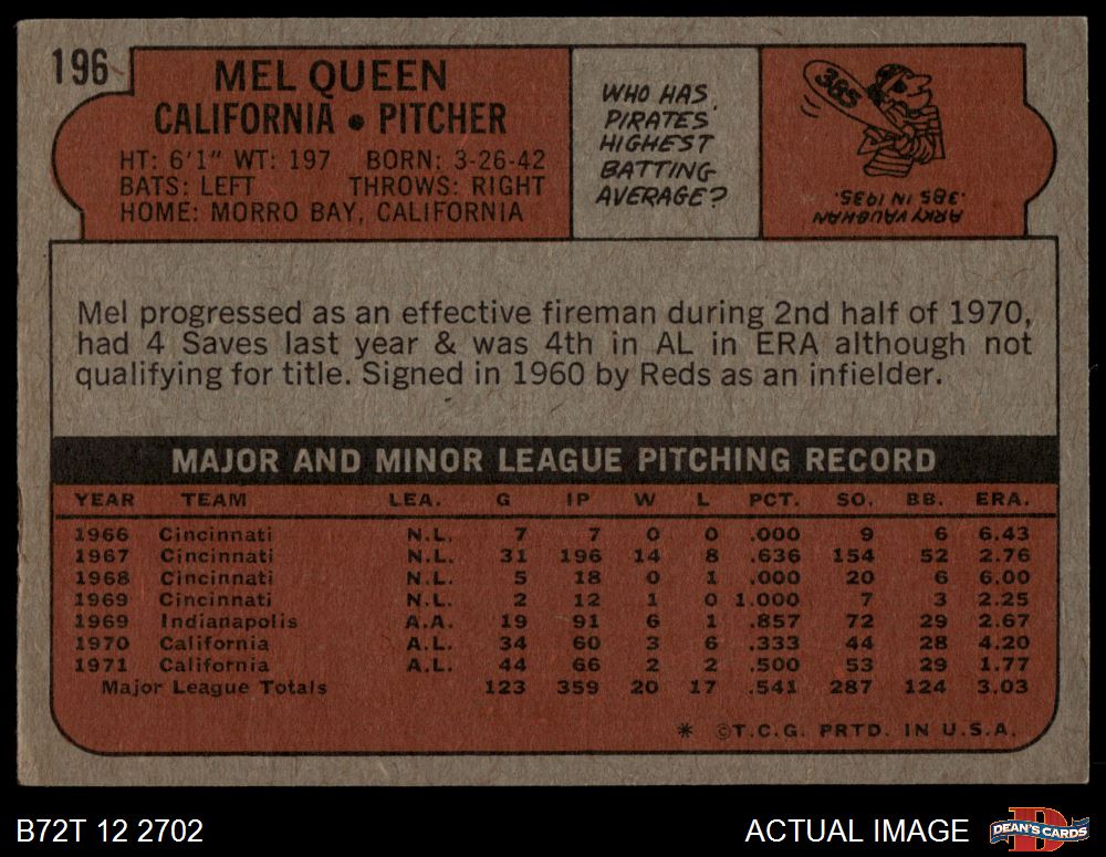 1972 Topps #196 Mel Queen