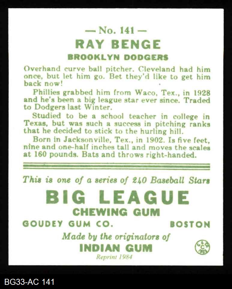 1933 Goudey Reprint #141 Ray Benge 8 - NM/MT