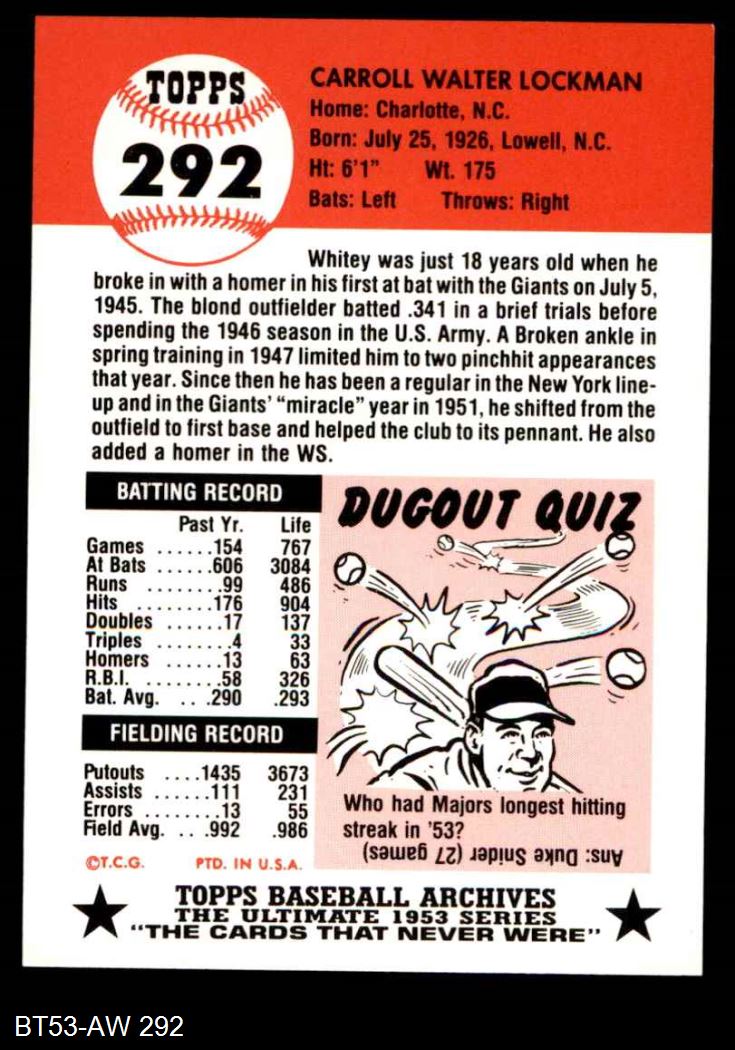1953 Topps Archives #292 Whitey Lockman 8 - NM/MT