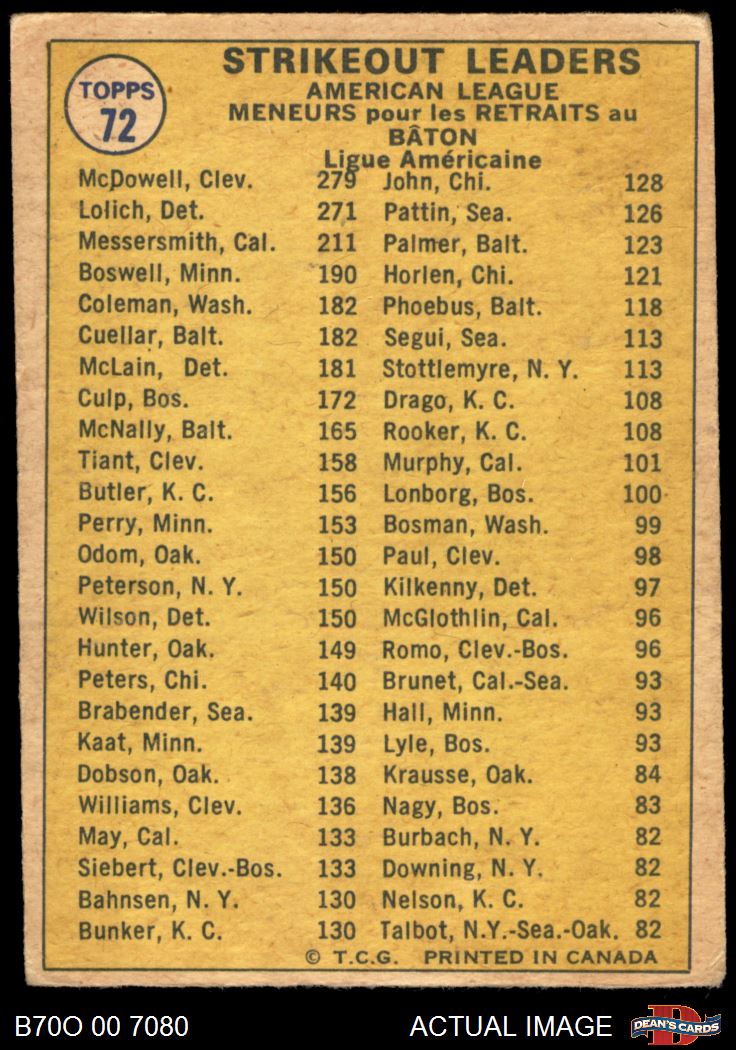 1970 O-Pee-Chee #72 AL Strikeout Leaders