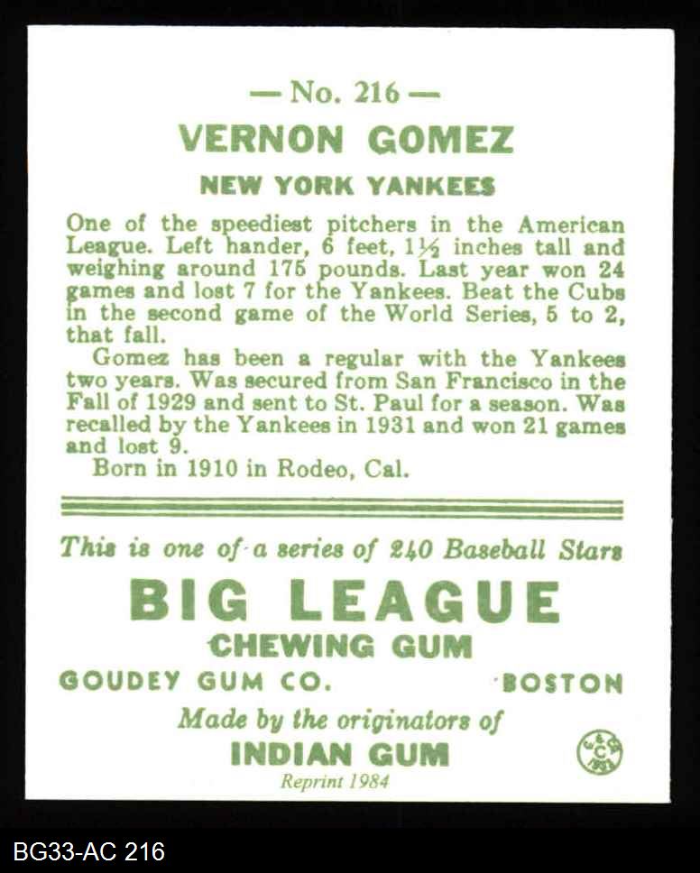 1933 Goudey Reprint #216 Lefty Gomez