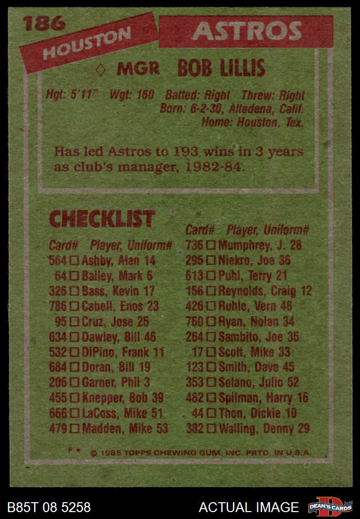 1985 Topps #186 Bob Lillis 8.5 - NM/MT+