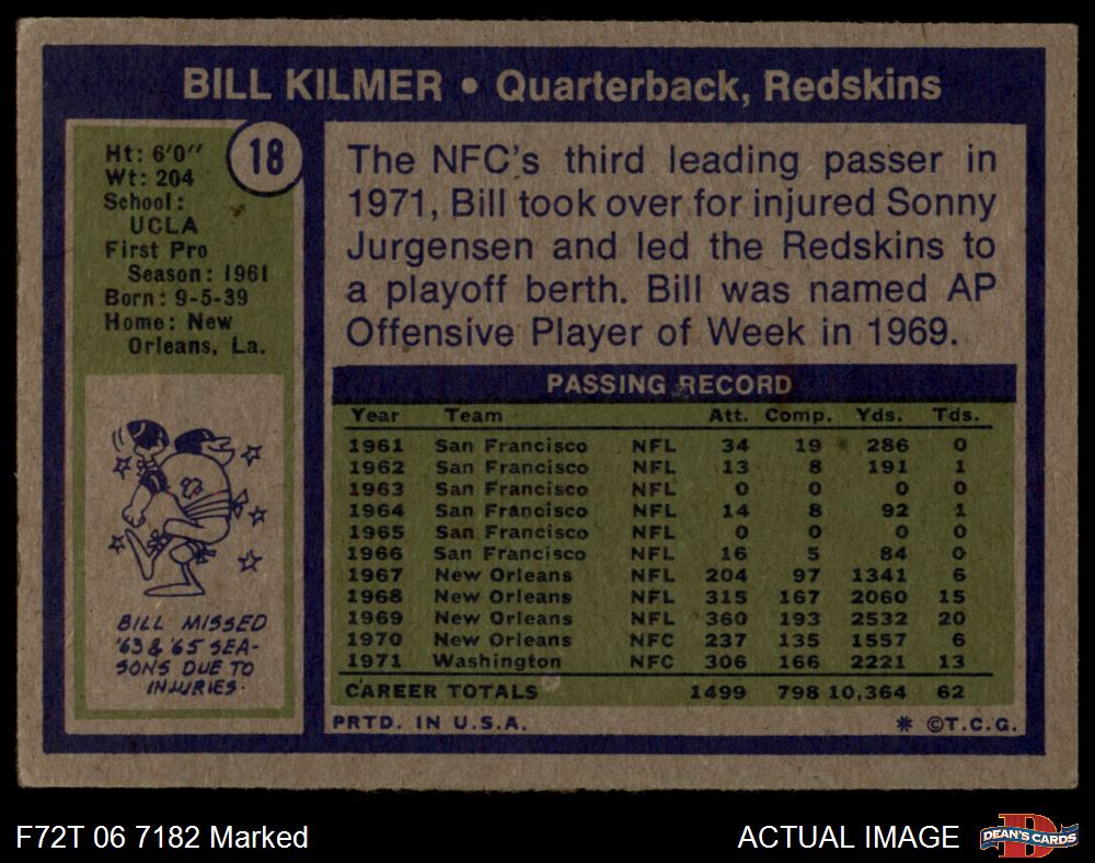 1972 Topps #18 Billy Kilmer Front Thumbnail